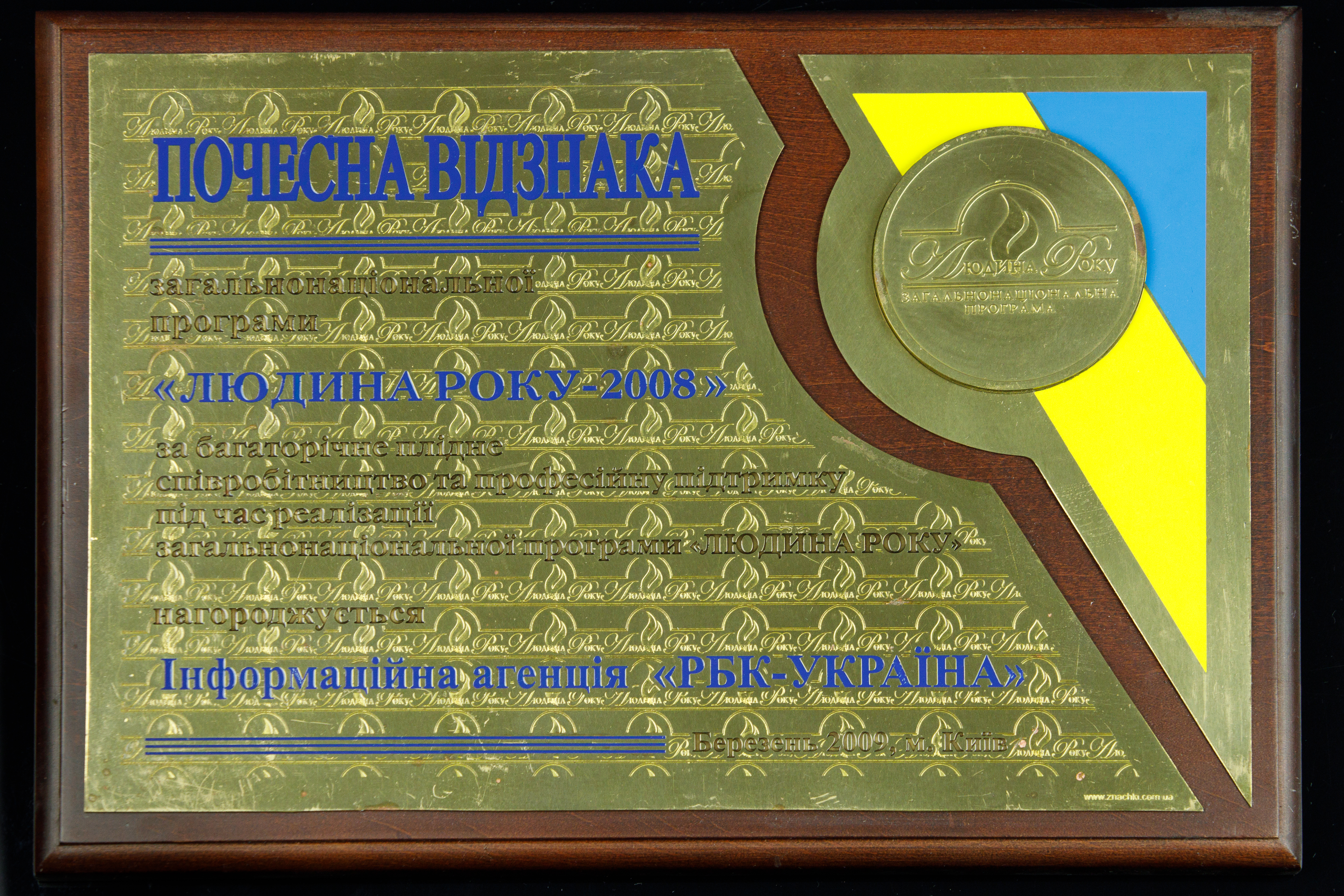 - Почесна відзнака загальнонаціональної програми “Людина року 2008” за багаторічне плідне співробітництво та професійну підтримку під час реалізації загальнонаціональної програми “Людина року”.