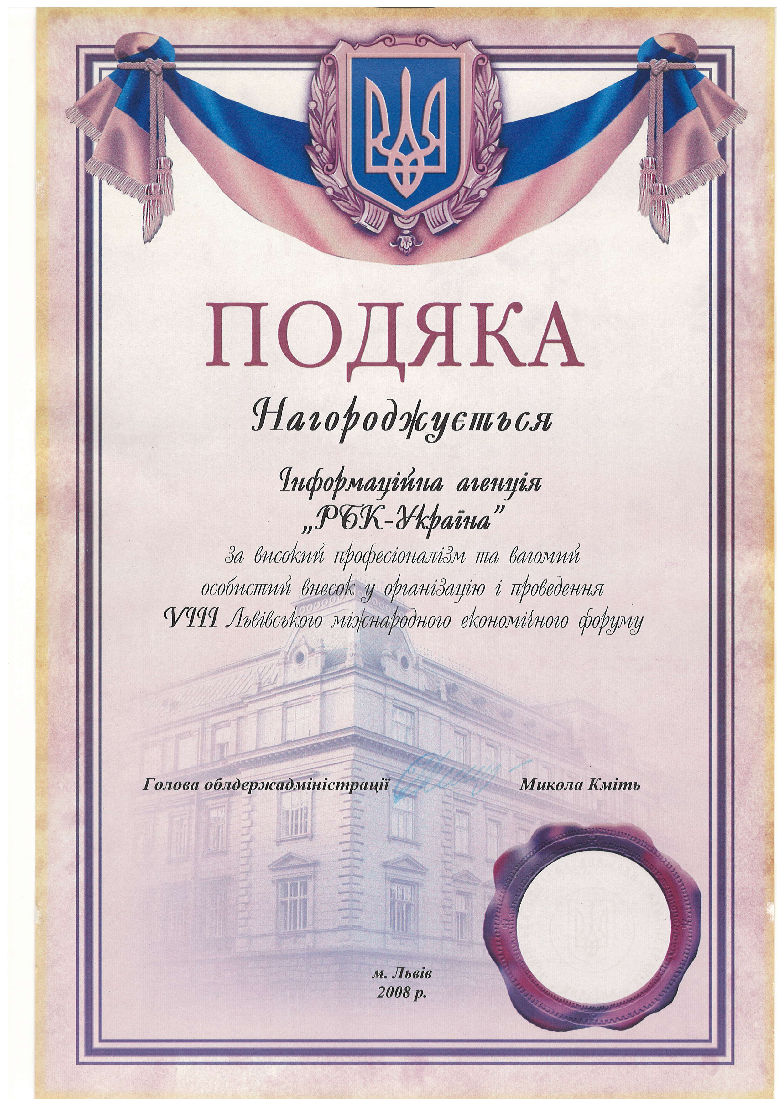 - Подяка за високий професіоналізм та вагомий особистий внесок у організацію і проведення VIII Львівського міжнародного економічного форуму.