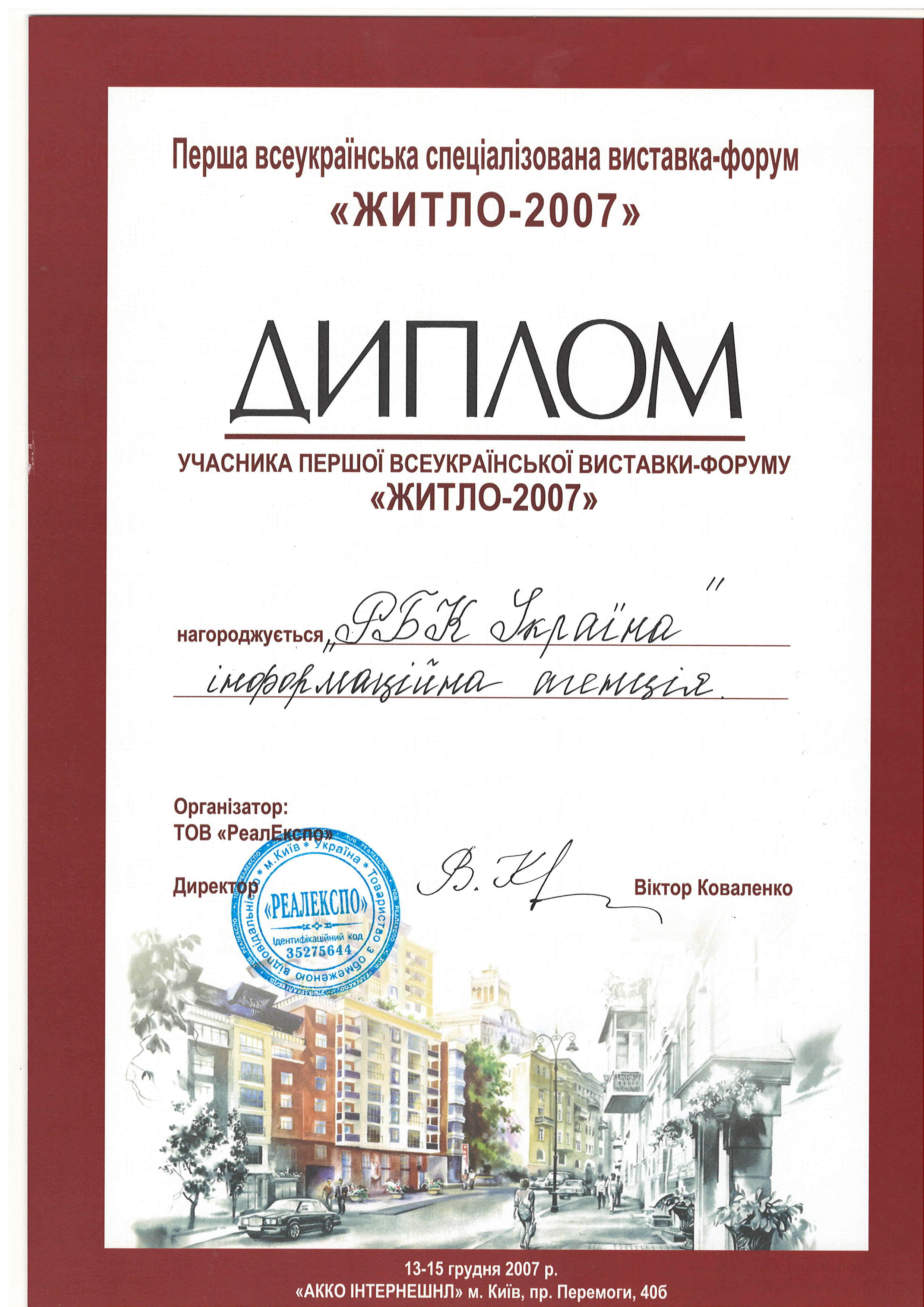 - Диплом учасника першої всеукраїнської виставки-форуму “Житло 2007”