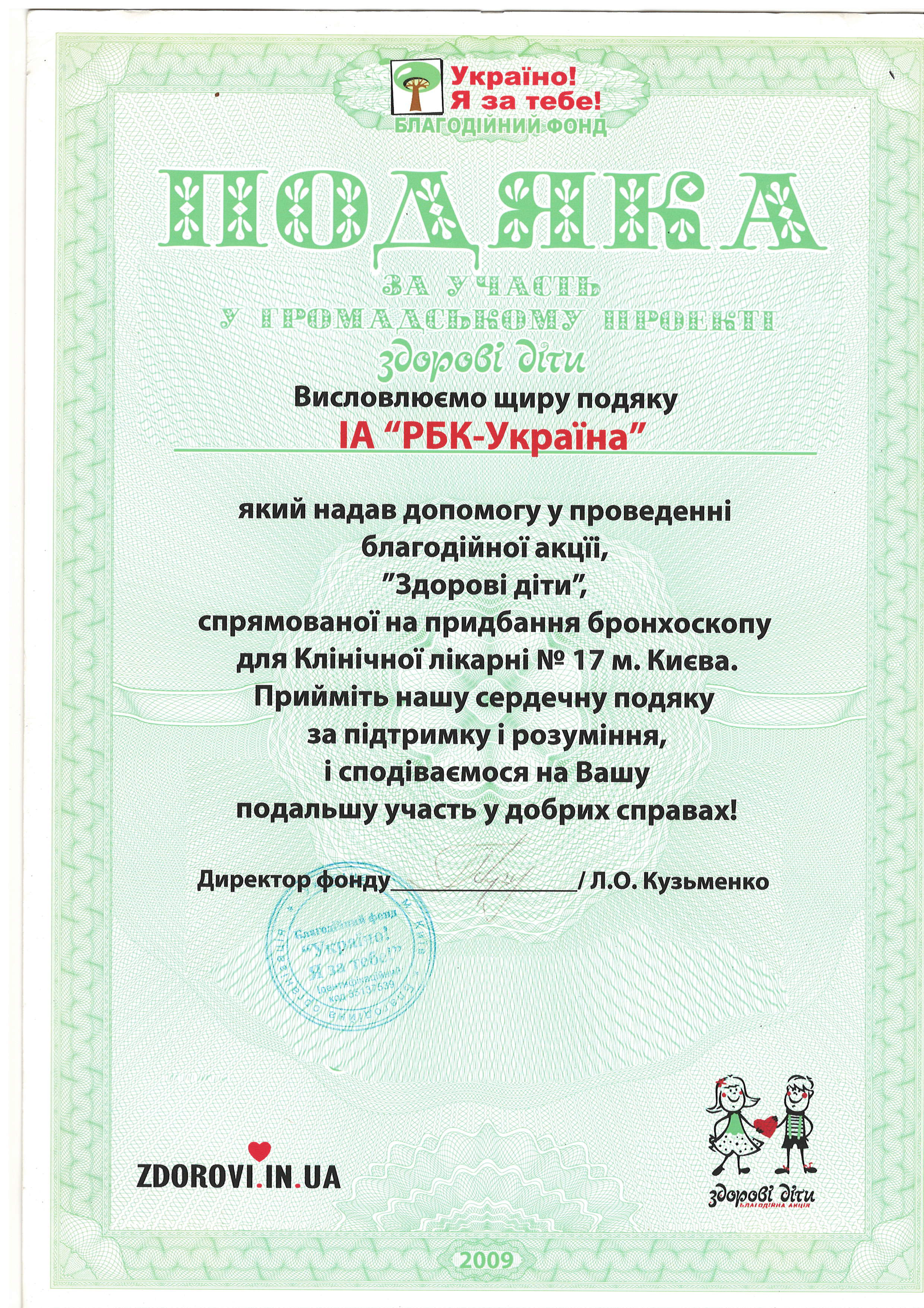 - Подяка за участь у громадському проекті “Здорові діти” за надання допомоги у проведенні благодійної акції “Здорові діти”, спрямованої на придбання бронхоскопу для Клінічної лікарні №17 міста Києва.