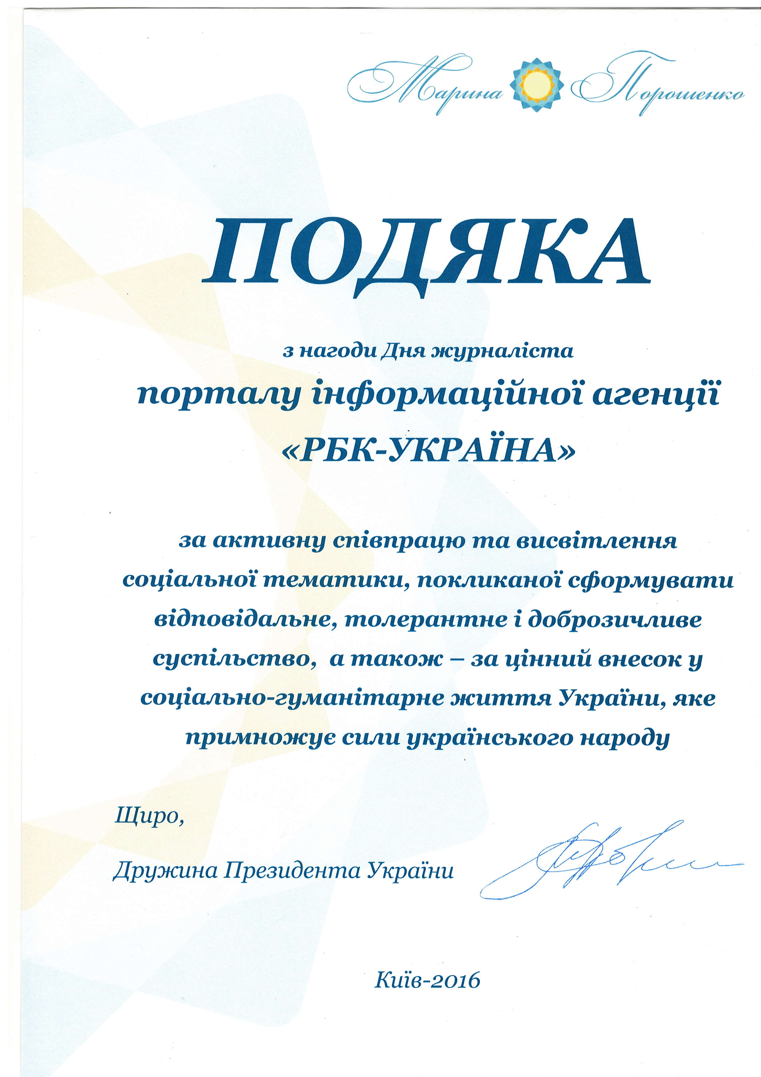 - Подяка за активну співпрацю та висвітлення соціальної тематики, покликане сформувати відповідальне, толерантне та доброзичливе суспільство, а також - за цінний внесок у соціально-гуманітарне життя України, яке примножує сили українського народу.