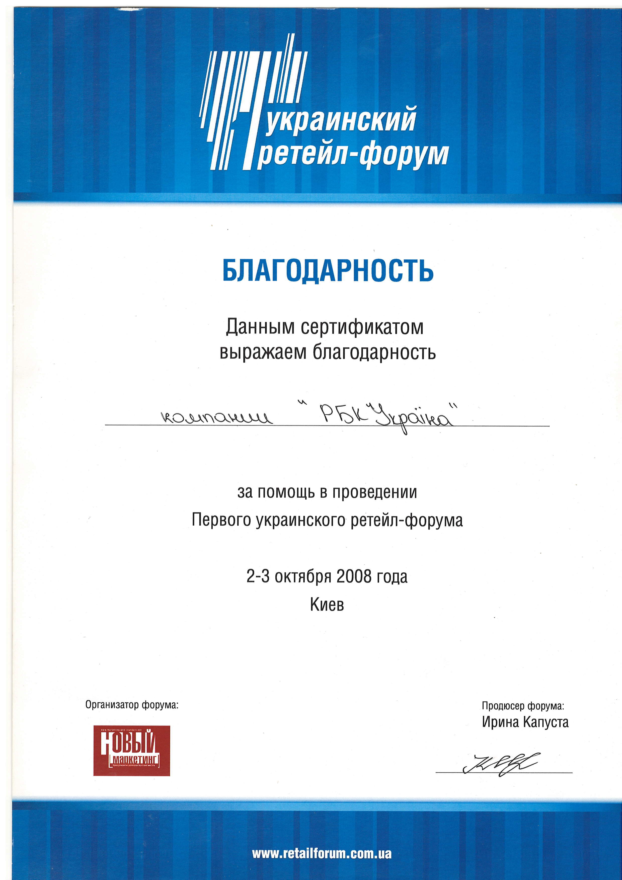 - Подяка за допомогу в проведенні Першого українського ритейл-форуму.
