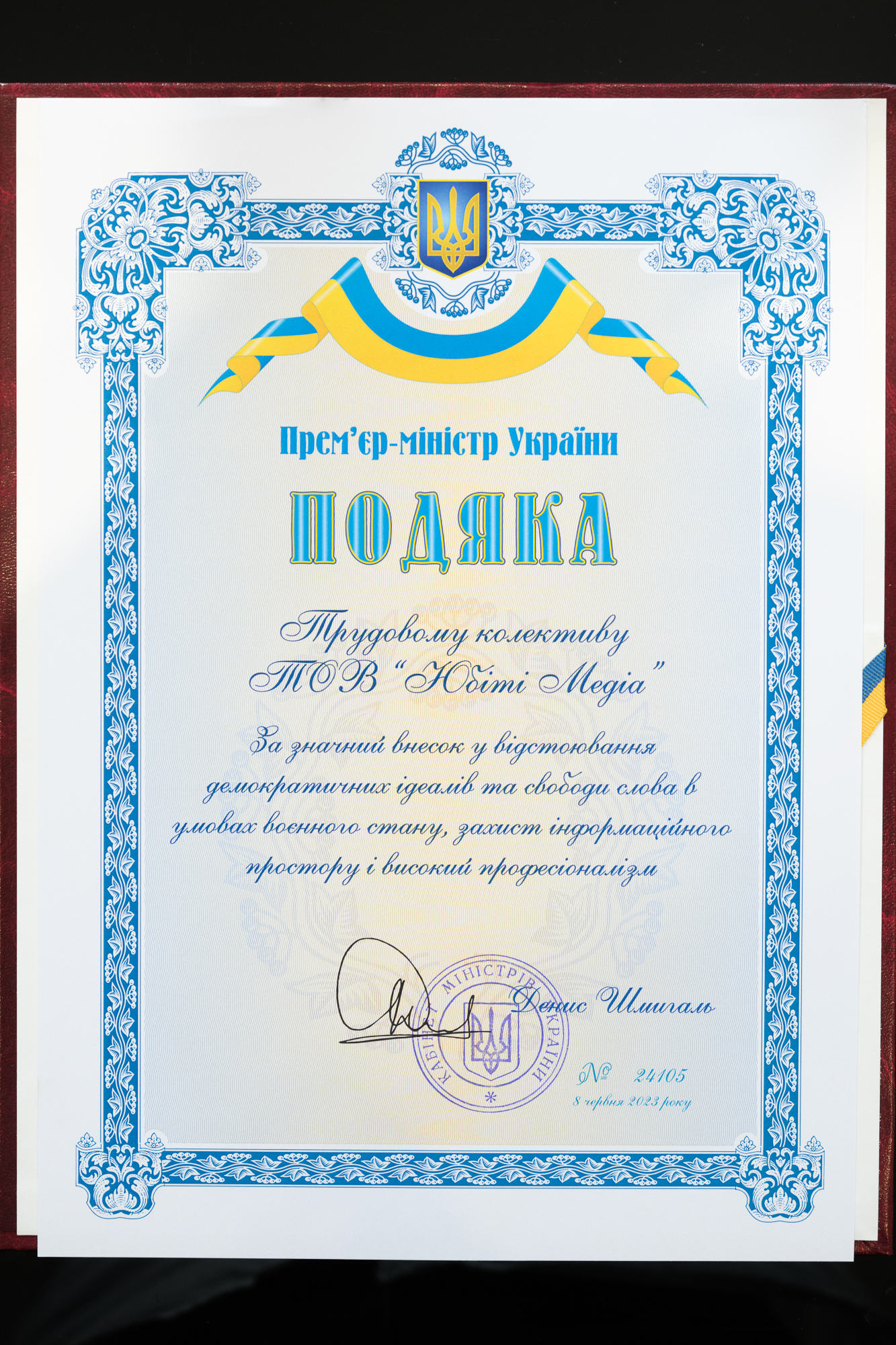 Подяка від прем’єр-міністра України Дениса Шмигаля трудовому колективу ТОВ “Юбіті Медіа” “За значний внесок у відстоювання демократичних ідеалів та свободи слова в умовах воєнного стану, захист інформаційного простору і високий професіоналізм”.