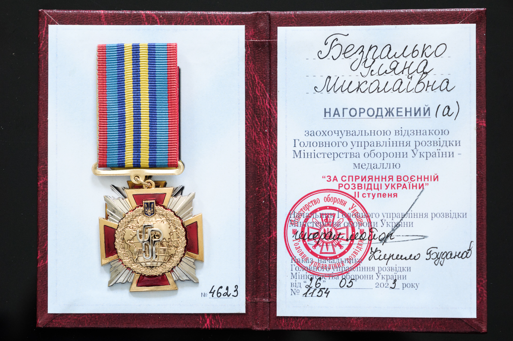 Відзнакою Головного управління розвідки України Міністерства оборони України “За сприяння воєнній розвідці України” ІІ ступеня наказом начальника ГУР Міноборони Кирила Буданова 26 травня 2023 року нагороджена Уляна Безпалько.