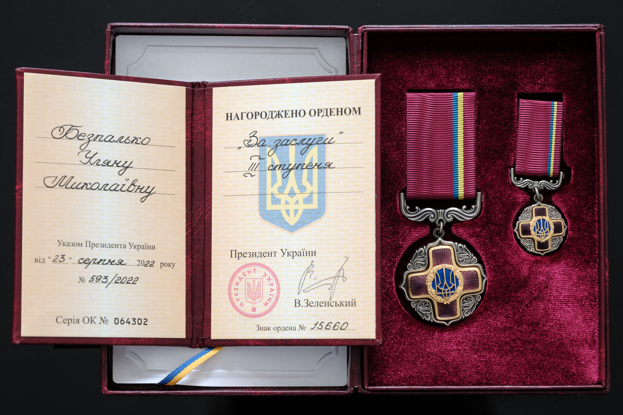 Орденом “За заслуги” ІІІ ступеня указом президента України Володимира Зеленського 23 серпня 2023 року нагороджена Уляна Безпалько.