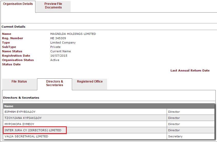 В то же время, по данным Министерства коммерции Кипра, у Magnilda Holdings Limited есть несколько директоров - наемных компаний, выполняющих соответствующие функции. Одна из них, Inter Jura Cy (Services) Ltd, была корпоративным директором компании Prime Asset Partners Ltd. Последняя, если верить "панамским документам", была создана в интересах президента Украины Петра Порошенко.