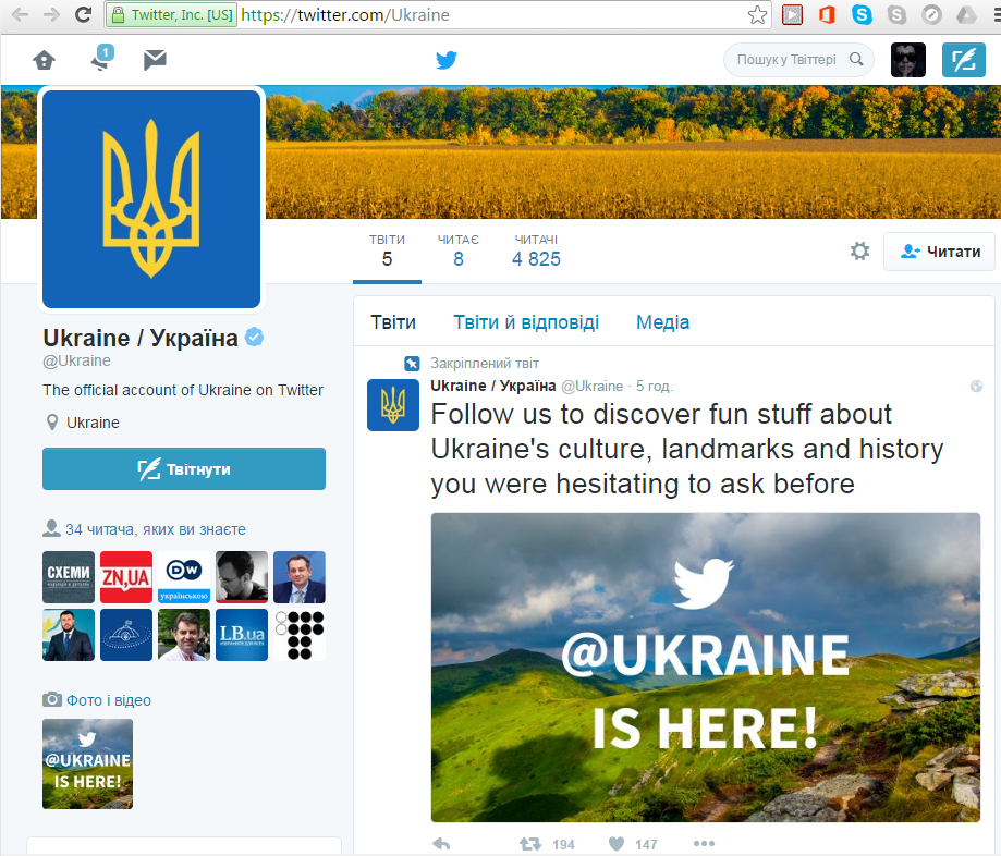 На момент публикации заметки на Twitter Украины подписались более четырех тысяч человек.