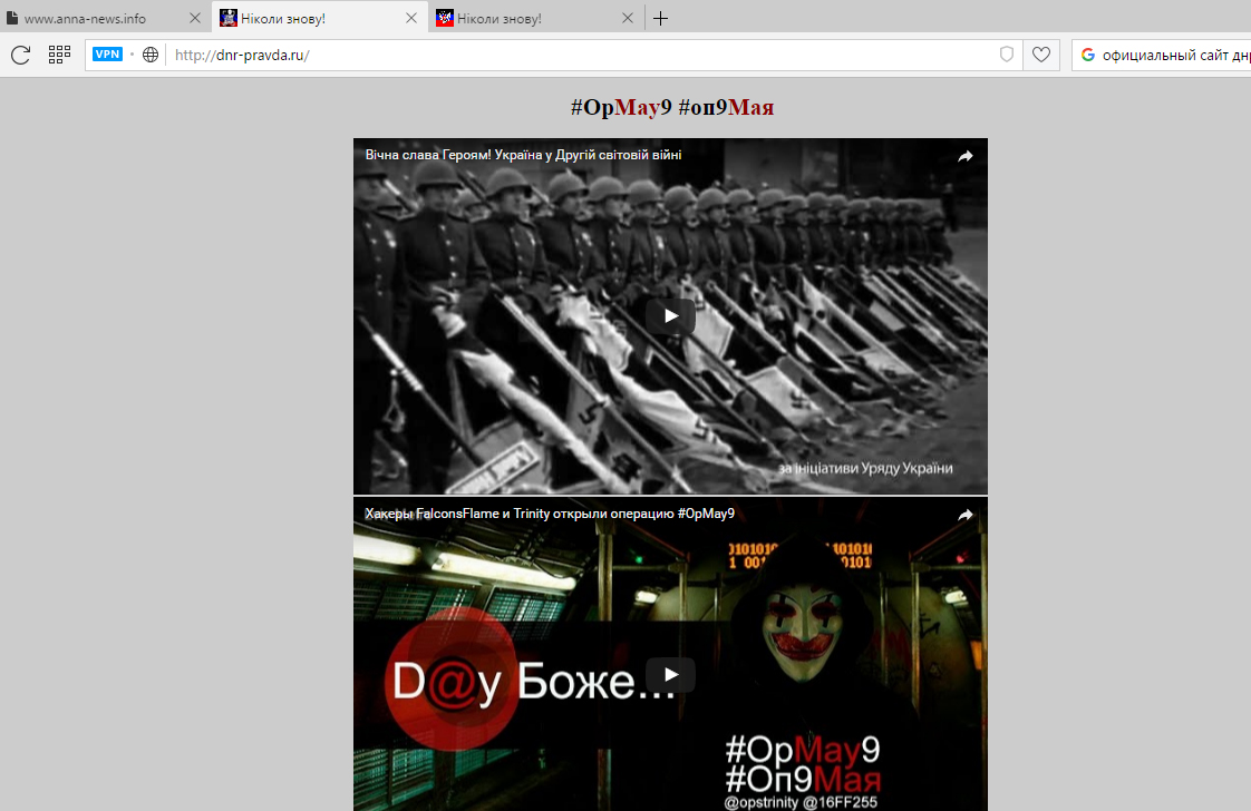 Альянс украинских хакеров из анонимных кибергруппировок FalconsFlame и Trinity провели операцию #OpMay9 с 00:00 9 мая, осуществив в общей сложности девять успешных взломов сайтов самопровозглашенной "Донецкой народной республики" (ДНР), пророссийских веб-ресурсов агрессивной антиукраинской пропаганды и частных военных компаний (ЧВК) РФ, которые действуют в Украине и Сирии под протекцией российской ФСБ. Об этом говорится в сообщении международного волонтерского сообщества "ИнформНапалм" по итогам Дня победы 2016.