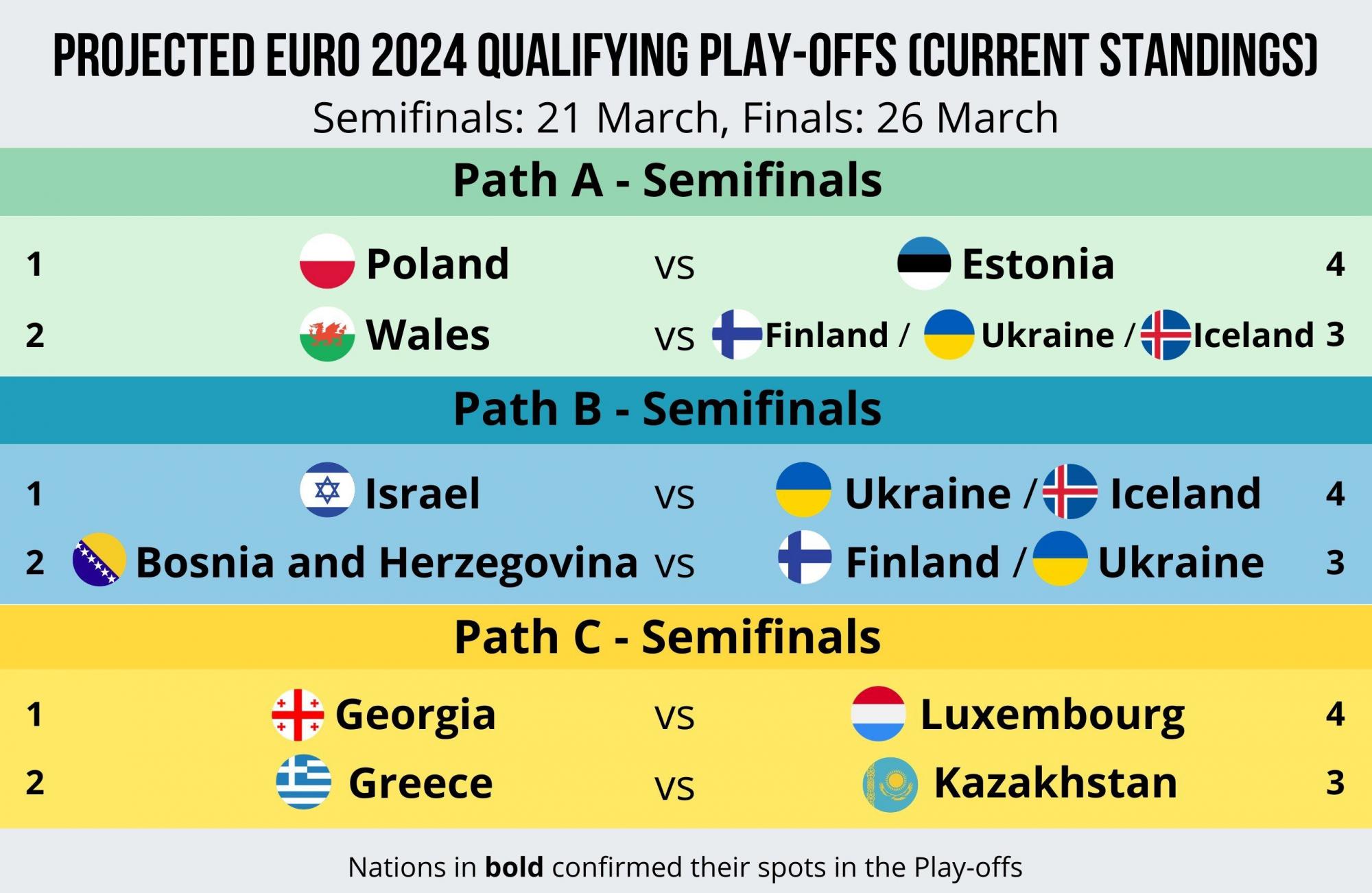 УЄФА розділив 12 збірних на три групи команд, т. зв. шляхи A, B і C. Збірна України наразі може опинитися в одному з перших двох. Якщо "синьо-жовті" потраплять у першу групу претендентів, то в півфіналі зустрінуться з кривдником у відборі до Мундіалю-2022 – Уельсом, а у фіналі – з переможцем протистояння збірних Польщі та Естонії.