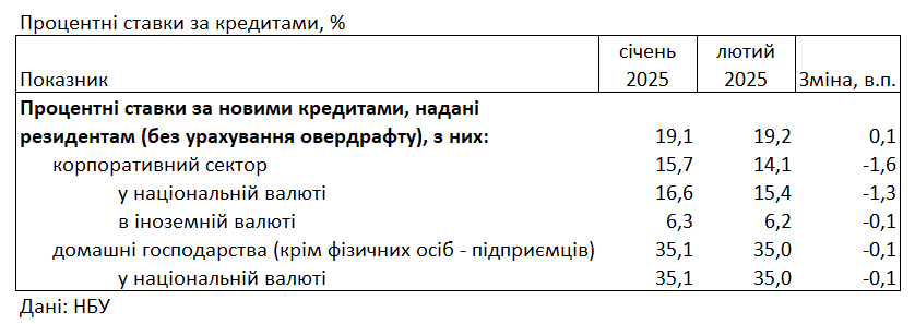 За даними НБУ, середні процентні ставки за новими кредитами банків для населення в національній валюті становили 35,0% річних. Місяць тому ставки були на рівні 35,1%.
