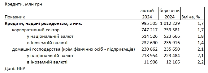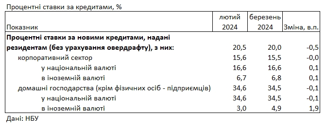 За даними НБУ, середні відсоткові ставки за новими кредитами банків для населення у березні 2024 року у національній валюті становили 34,5% річних. Ставки впали на 0,1 в.п.