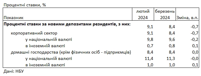 Ставки банків за новими депозитами у гривні для населення знизилися з 11,4% до 11,3% річних. Ставки за новими депозитами для населення у валюті залишилися на рівні 1,0%.