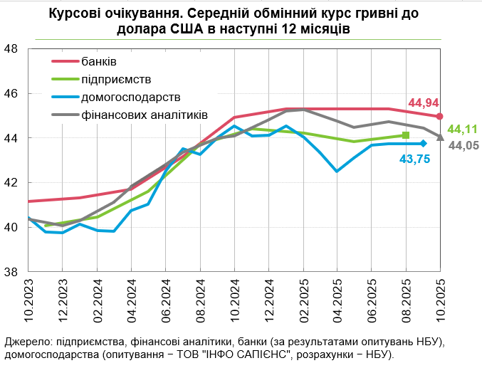 Фінансові аналітики в жовтні 2025 року поліпшили прогноз щодо курсу долара найближчих 12 місяців до 44,05 грн/долар. У вересні вони очікували курс 44,45 грн/долар.