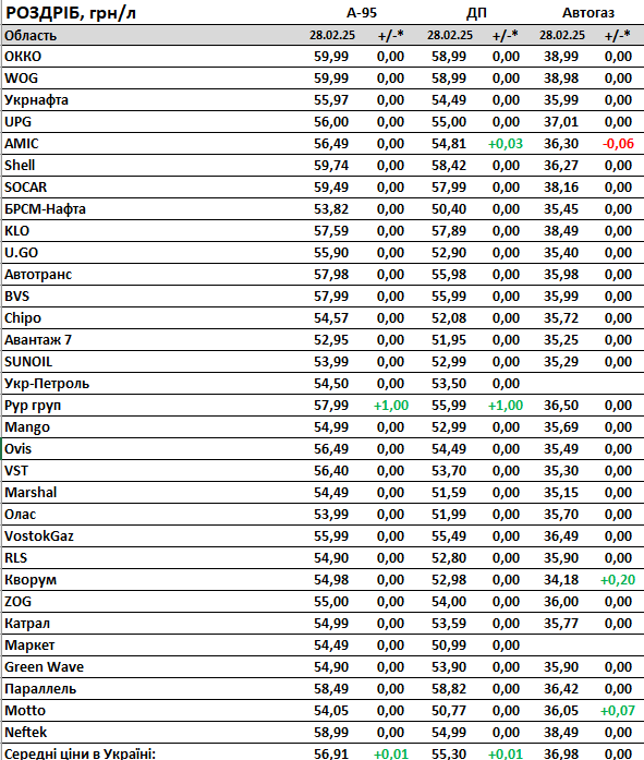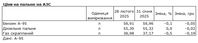 За даними моніторингу, середні роздрібні ціни 28 лютого 2025 року на бензин А-95 становлять 56,91 гривні за літр (-0,05 гривні за місяць), на дизельне паливо 55,30 гривні за літр (-0,02 гривні), на автогаз 36,98 гривні за літр (-0,19 гривні).
