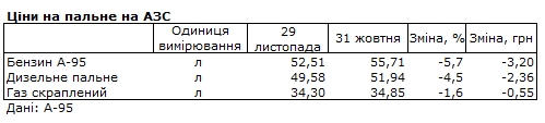 За даними моніторингу, середні роздрібні ціни 31 жовтня на бензин А-95 становлять 52,51 гривні за літр (-3,20 гривні за місяць), на дизельне паливо 49,58 гривні за літр (-2,36 гривні), на автогаз – 34,30 гривень за літр (-0,55 гривень).