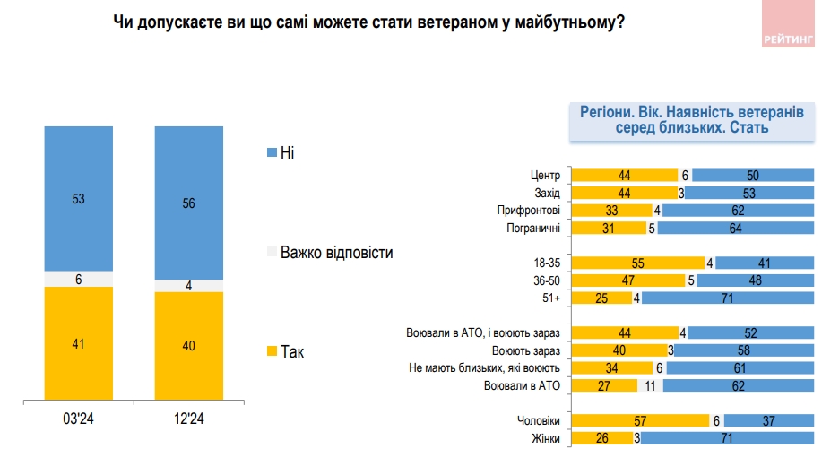 У грудні 2024 року 40% українців допускають, що можуть стати ветеранами у майбутньому, 56% - протилежної думки. Серед чоловіків більшість допускають, що доведеться воювати.
