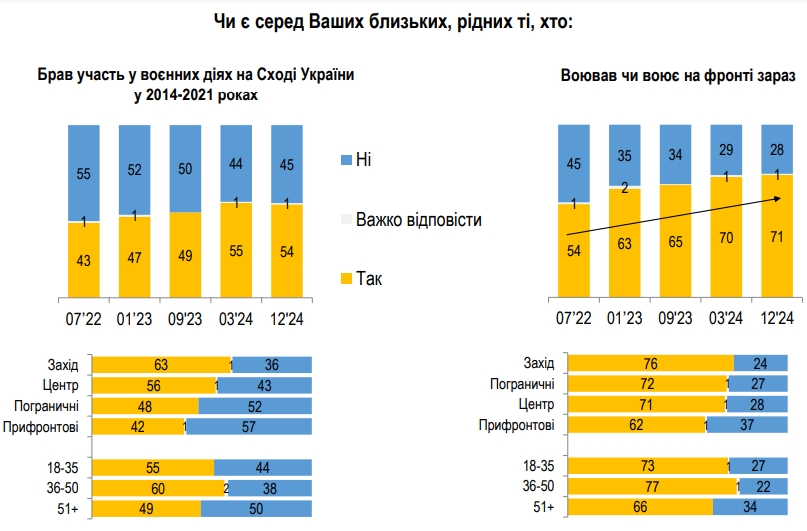 Більшість (54%) опитаних зазначили, що серед їхніх близьких та рідних є ті, хто брав участь у воєнних діях на території України, з 2014 по 2021 роки. 71% мають серед близьких тих, хто воював чи воює на фронті, починаючи з 24 лютого 2022 року. У порівнянні із попередніми опитуваннями, починаючи з 2022 року, зростає кількість тих, чиї близькі сьогодні воюють на фронті.