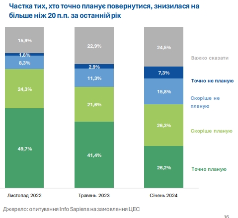 Більшість українців все ще планують повернутися до України (26% точно та 26% скоріше). З них 61% планує це зробити після війни.