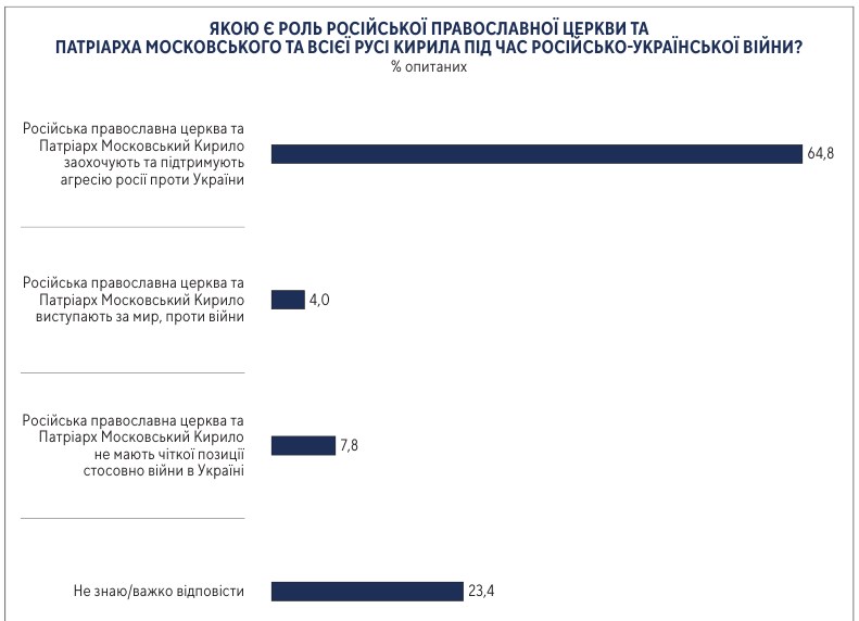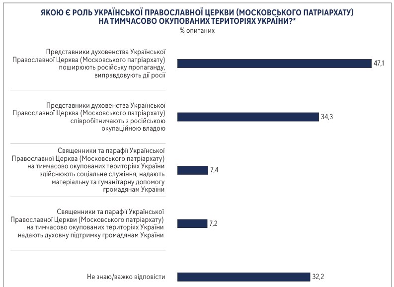 Оцінюючи роль УПЦ (Московського патріархату) на тимчасово окупованих територіях України, 47% опитаних вважають, що представники духовенства УПЦ (МП) поширюють російську пропаганду, виправдовують дії Росії, 34% респондентів дотримуються думки, що вони співпрацюють з російською окупаційною владою.