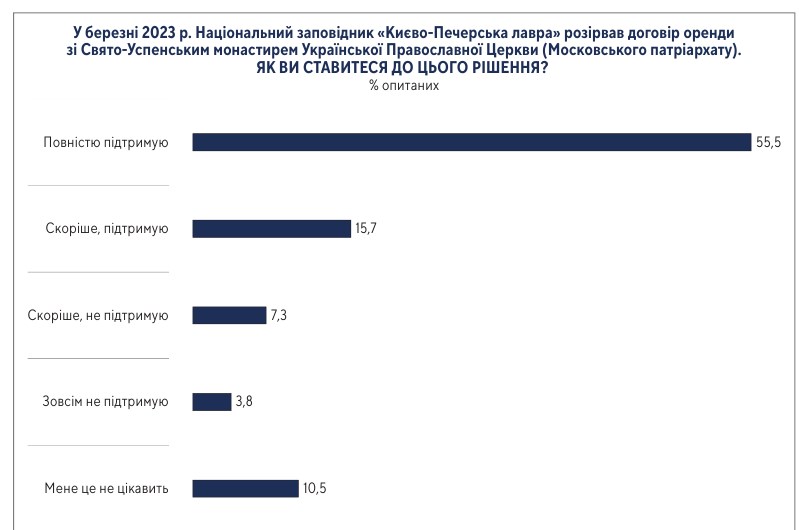 Також 71% опитаних громадян повною мірою або скоріше підтримали розрив договору оренди Національним заповідником "Києво-Печерська лавра" зі Свято-Успенським монастирем УПЦ (Московського патріархату) у березні 2023 року.