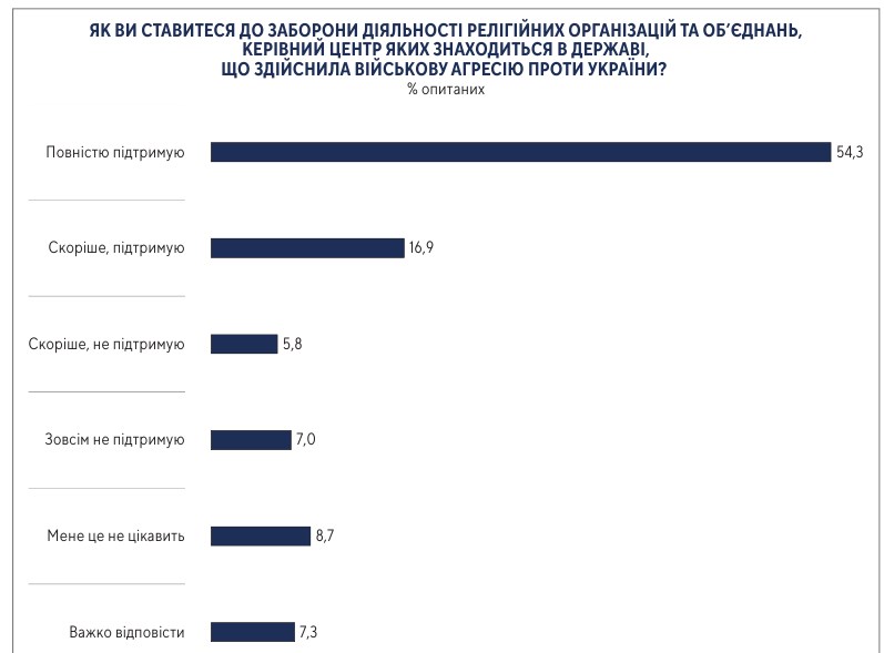 Переважна більшість (71%) респондентів повною мірою або скоріше підтримують заборону діяльності релігійних організацій та об’єднань, керівний центр яких знаходиться в державі, що здійснила військову агресію проти України.