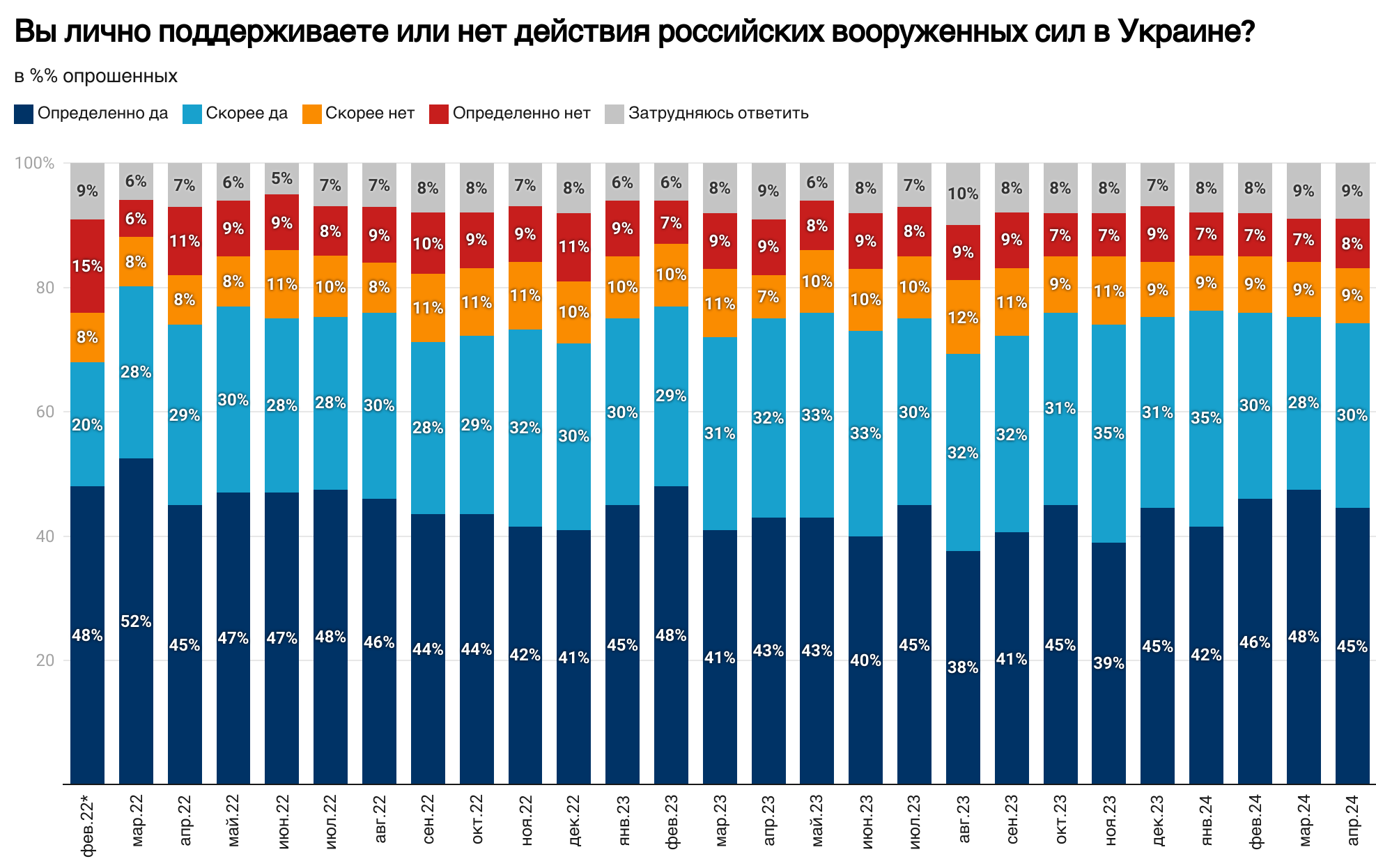 З вересня 2023 року рівень підтримки війни проти України коливається довкола 75%, у квітні її схвалюють три чверті.