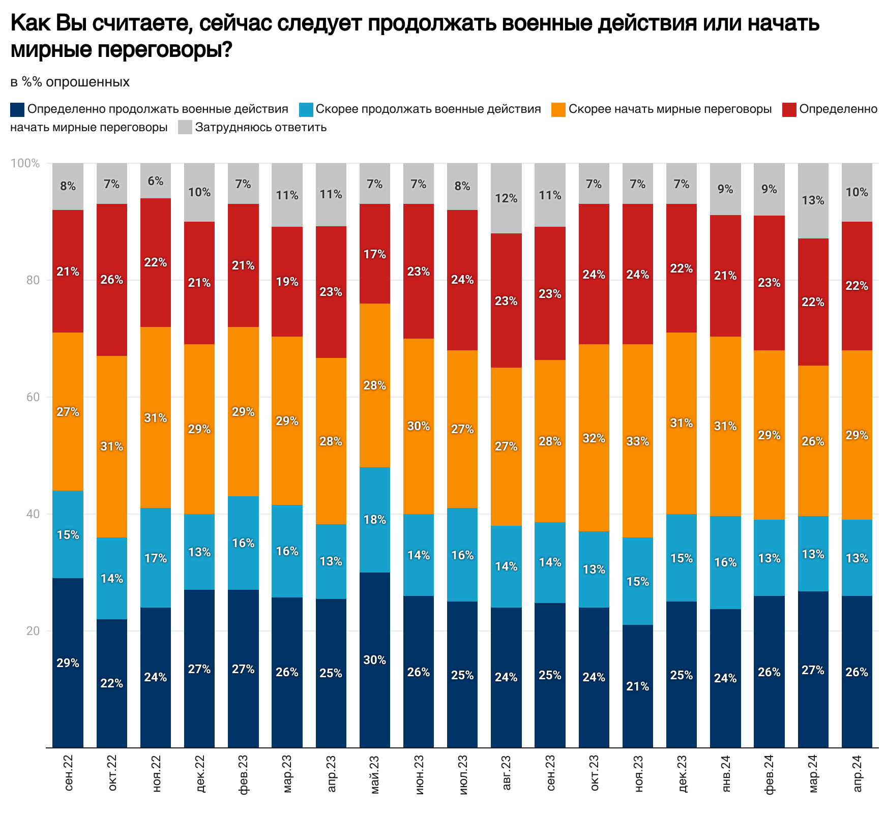 Після нетривалого зниження наприкінці минулого - на початку нинішнього року почала відновлюватися частка жителів Росії, які виступають за мирні переговори – зараз таких близько половини (51%). Частка тих, хто вважає, що треба продовжувати військові дії, за той же період мінялася мало, сьогодні таких 39%.