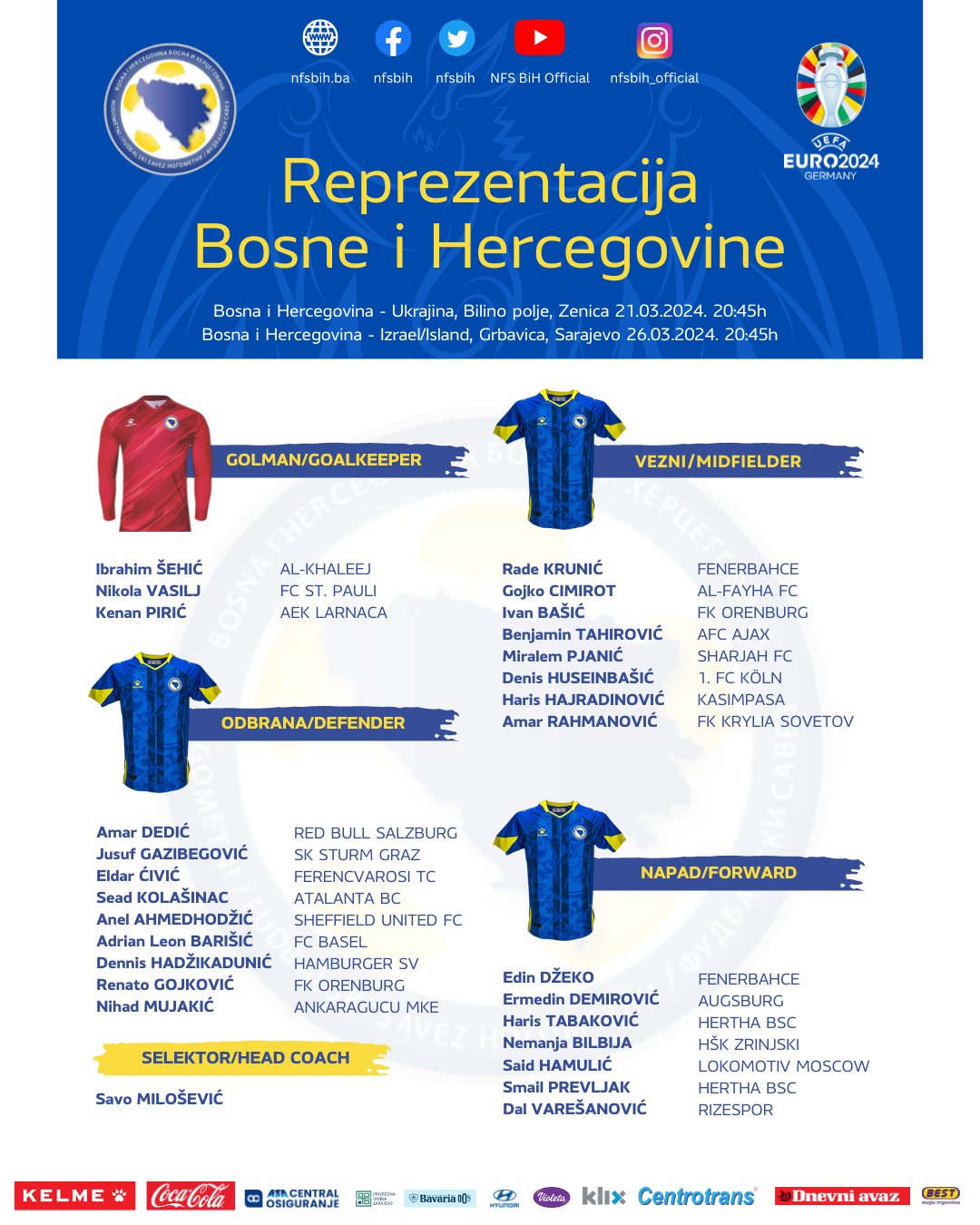 Тренерський штаб національної команди Боснії і Герцеговини оприлюднив заявку на півфінальний матч плей-офф Ліги націй. Переможець міні-турнір поїде на Євро-2024.