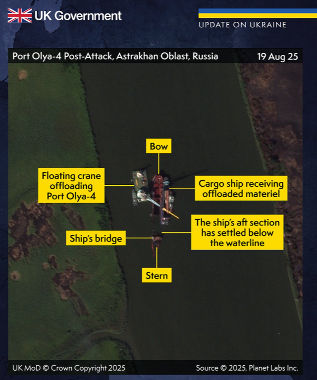 Генштаб України повідомив, що 14 серпня 2025 року українські сили завдали удару безпілотником по російському вантажному судну в порту Оля на Каспійському морі. Судно перевозило обладнання та боєприпаси з Ірану, включно з деталями для дронів. Унаслідок атаки корабель виявився частково затопленим.
