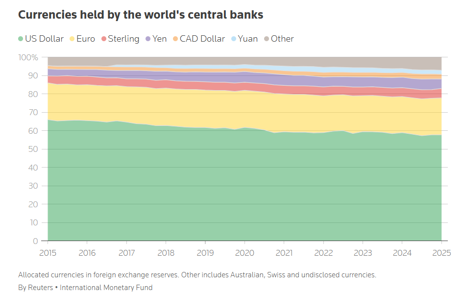 Частка долара США в глобальних валютних резервах, про які звітують країни до Міжнародного валютного фонду, дещо знизилася на 0,1 в.п. до 57,7% у першому кварталі 2025 року. Частка резервів у євро збільшилася.