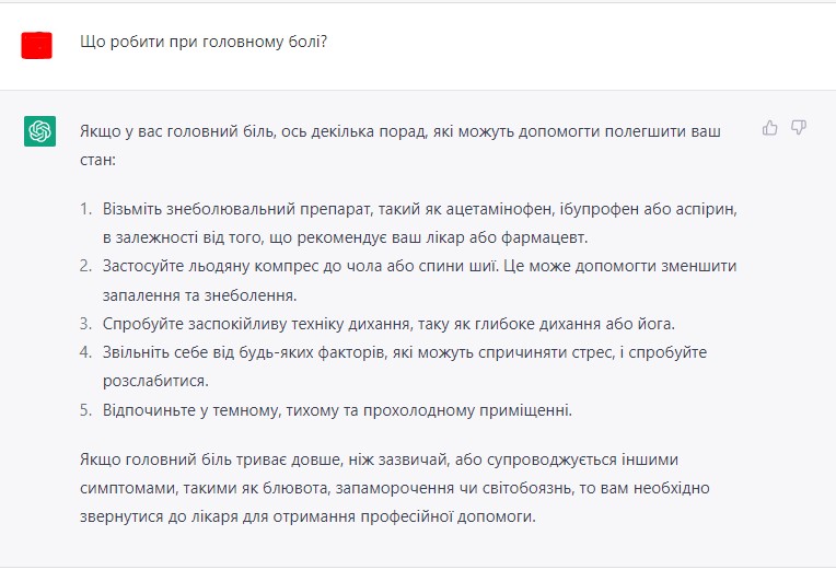 ChatGPT нагадує, наприклад, що робити при головному болю, але при цьому радить звернутися до лікаря.