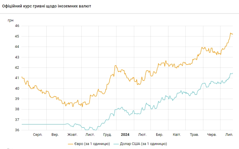 Офіційний курс на 22 липня 2024 року встановлено на такому рівні: 41,4912 гривні за 1 долар (+0,0692 грн). Попередній максимум був 18 липня – 41,4627.