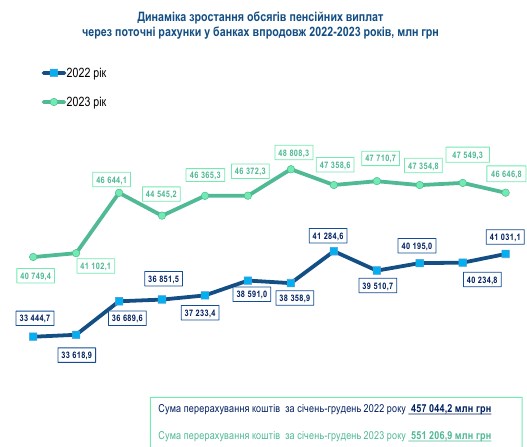 За даними ПФУ, сума перерахування коштів через банки за січень-грудень 2023 року становила 551,2 млрд гривень, що на 20,6% більше, ніж у 2022 році (457,0 млрд гривень).