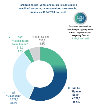 За даними ПФУ, частка Приватбанку становить 56,6%. У цьому держбанку одержують гроші 4,727 млн осіб. На другому місці державний Ощадбанк (33,3%, пенсії одержують 2,779 млн осіб).