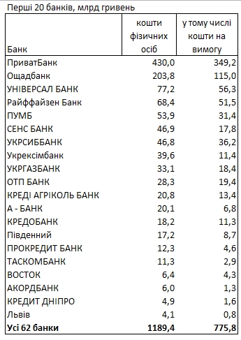 За даними НБУ, найбільше грошей населення в державних ПриватБанку - 430,0 млрд гривень та Ощадбанку - 203,8 млрд гривень