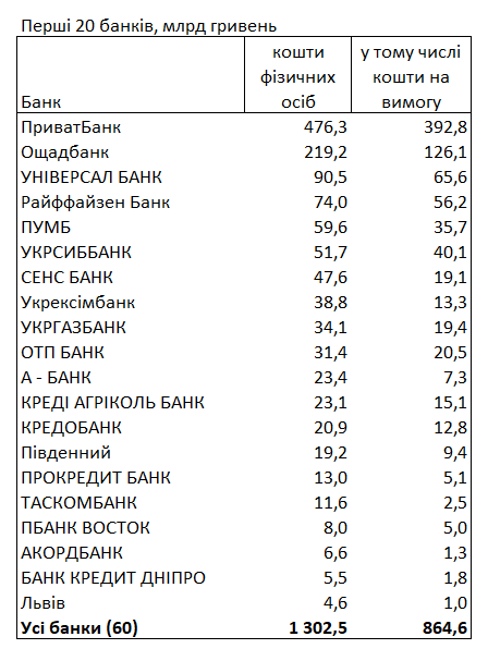 За даними НБУ, найбільше грошей населення в державних ПриватБанку - 476,3 млрд гривень та Ощадбанку - 219,2 млрд гривень