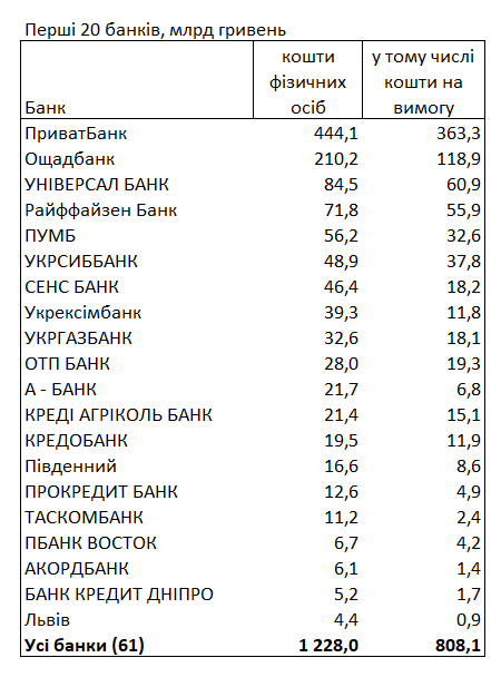 За даними НБУ, найбільше грошей населення в державних ПриватБанку - 444,1 млрд гривень та Ощадбанку - 210,2 млрд гривень