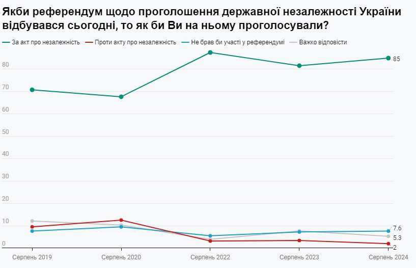 Підтримка незалежності продовжує залишатися на історичному максимумі за останні 23 роки соціологічних досліджень. Вищий цей показник був лише у серпні 2022 року - 87,5%