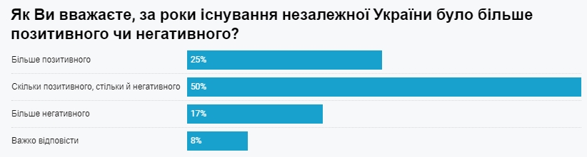 Близько 50% українців вважають, що за роки незалежності України відбулося скільки позитивного, стільки й негативного. При цьому кожен четвертий (25%) вважає, що позитиву було більше, тоді як для 17% переважав негатив.