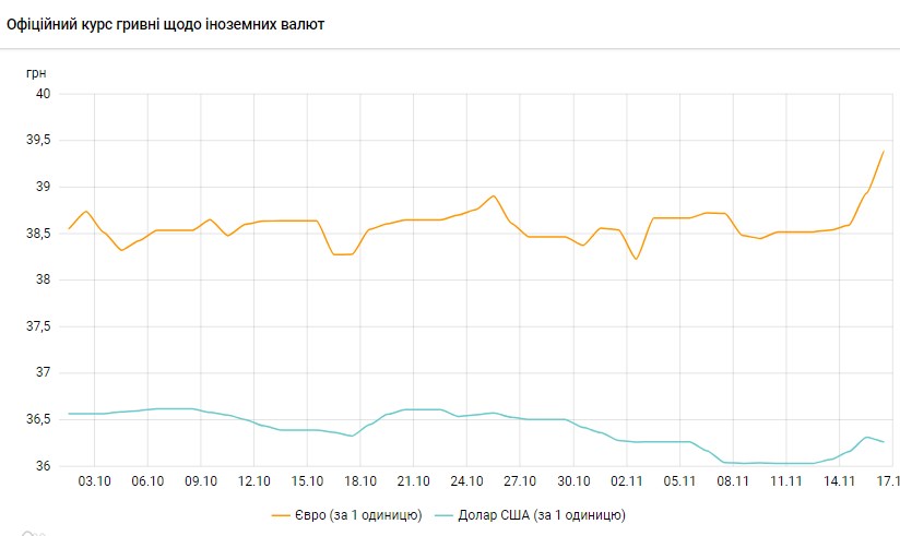 Офіційний курс на 17 листопада 2023 року встановлено на такому рівні: 36,2496 грн за 1 долар (-0,0147 грн).