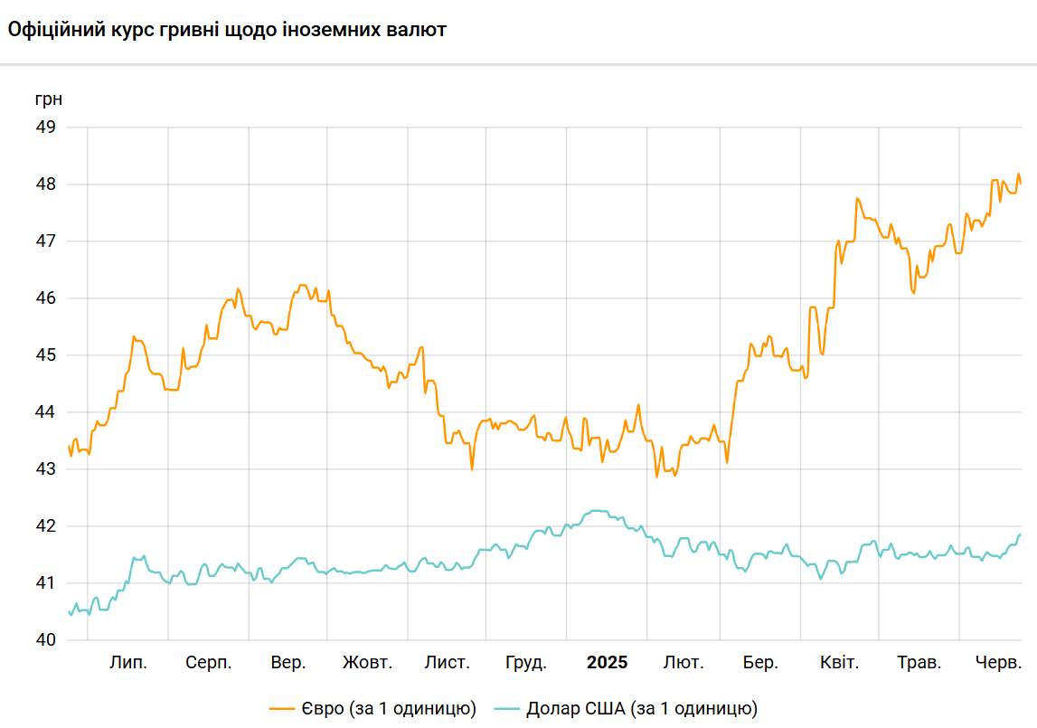 Офіційний курс на 24 червня 2025 року встановлено на такому рівні: 41,8702 гривень за 1 долар (+0,0367 грн).