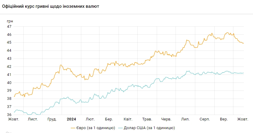 Офіційний курс на 17 жовтня 2024 року встановлено на такому рівні: 41,2256 грн за 1 долар (+0,0117 грн).