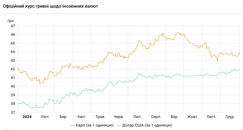 Офіційний курс на 1 січня 2025 року встановлено на такому рівні: 42,0295 гривень за 1 долар (-0,0095 грн).