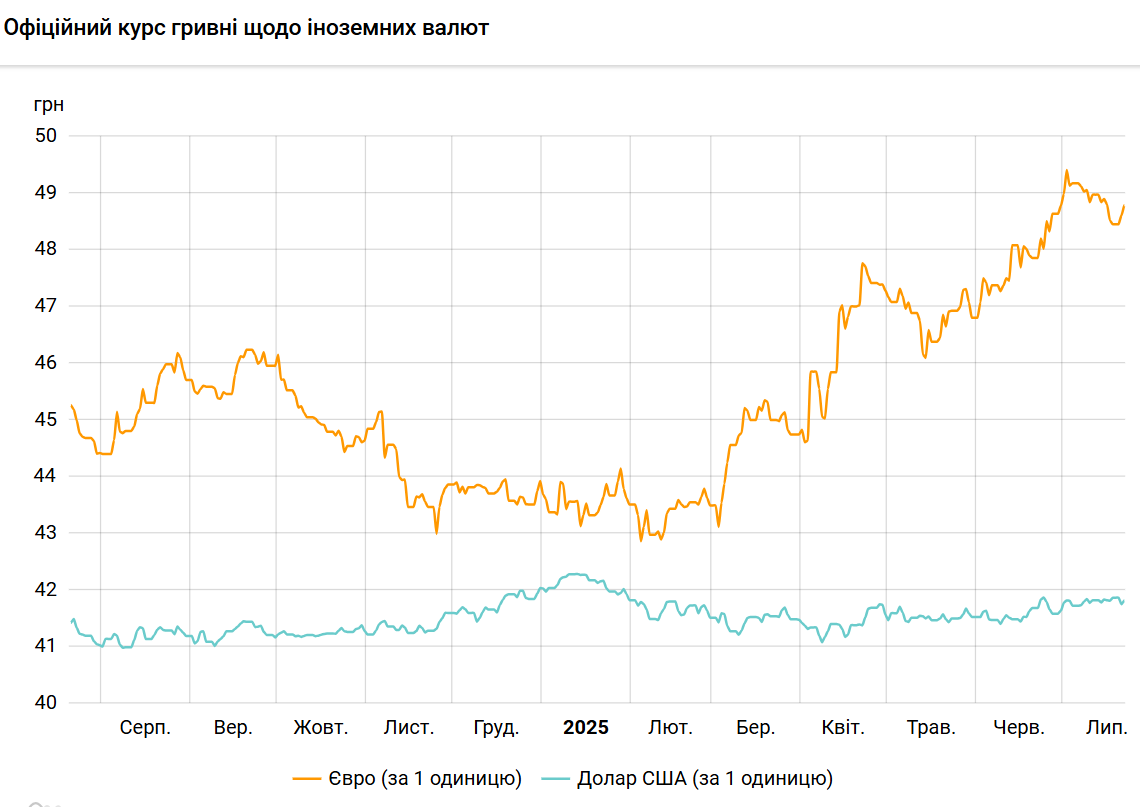 Офіційний курс на 22 липня 2025 року встановлено на такому рівні: 41,8194 гривень за 1 долар (+0,0680 грн).