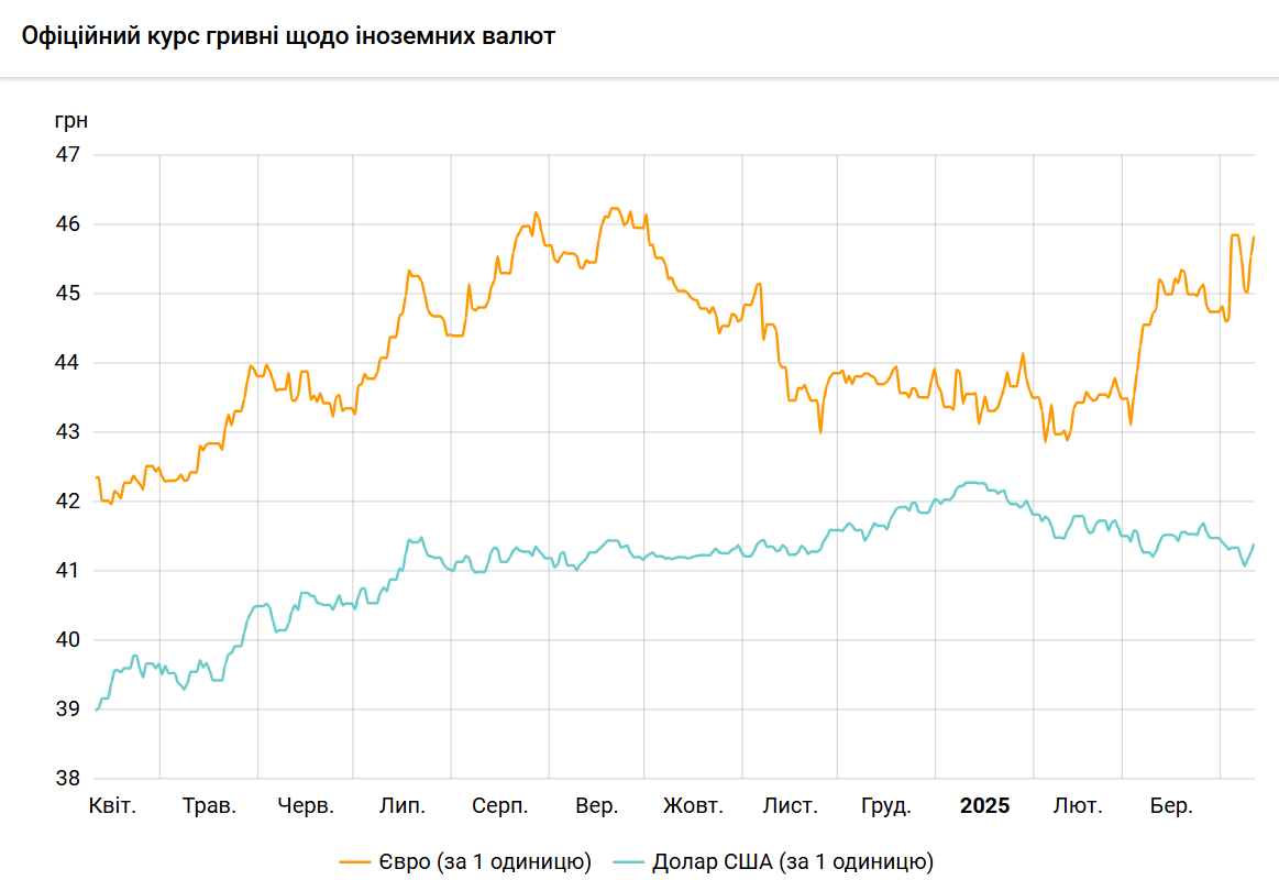 Офіційний курс євро становитиме 45,8415 гривень за 1 євро (+0,2944 грн).