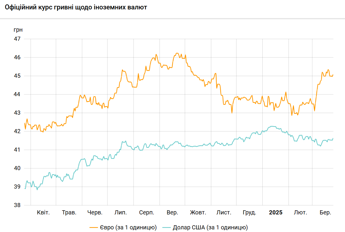 Офіційний курс на 25 березня 2025 року встановлено на такому рівні: 41,6446 гривень за 1 долар (+0,1169 грн).