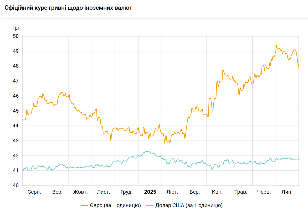 Офіційний курс на 1 серпня 2025 року встановлено на такому рівні: 41,7132 гривень за 1 долар (-0,0530 грн). За місяць курс зріс на 12 копійок.