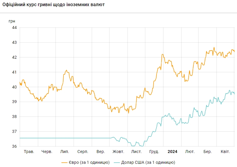 Офіційний курс на 1 травня 2024 року встановлено на такому рівні: 39,5151 грн за 1 долар (-0,1537 грн).