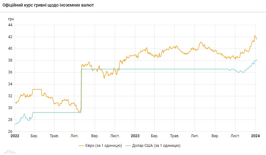 Курс долара за грудень 2023 року зріс на 4,4% - до 37,98 грн/долар. На початку 2024 року курс зріс до 38,11 грн/долар - чергового максимуму.
