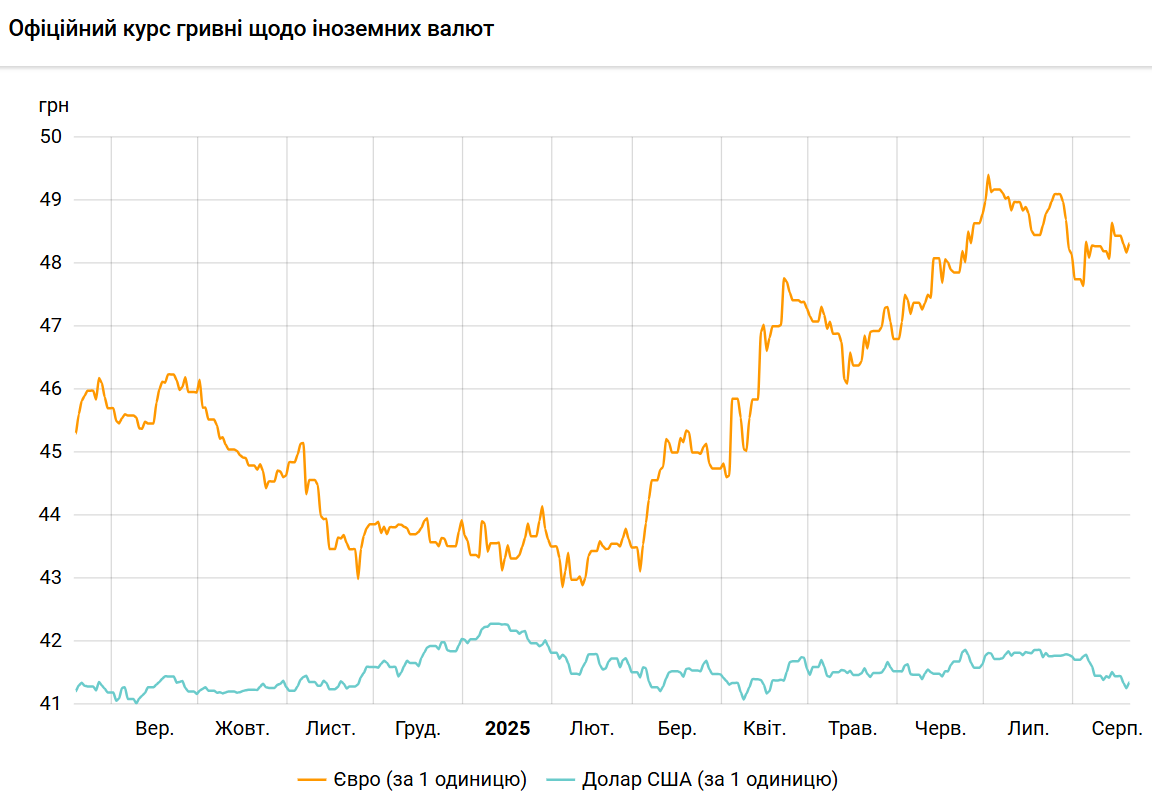 Офіційний курс на 20 серпня 2025 року встановлено на такому рівні: 41,3557 гривень за 1 долар (+0,0968 грн).
